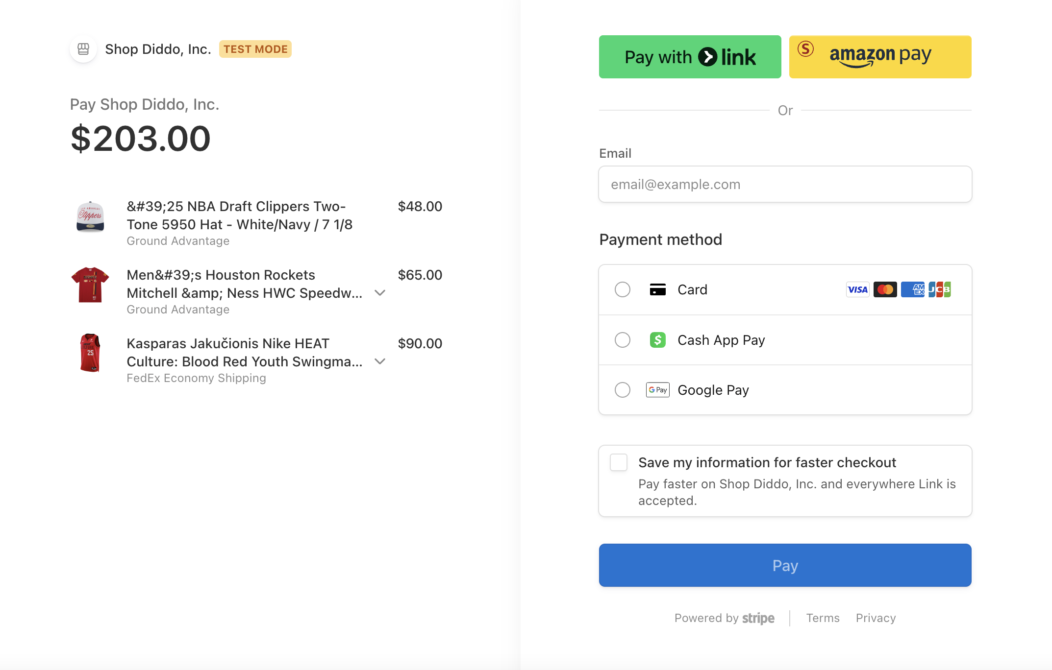 Once the cart is complete and shipping information is set, you're ready to initiate checkout. This step creates a payment session using your configured gateway (e.g. Stripe). The customer is then redirected to a secure hosted checkout page to complete their purchase.